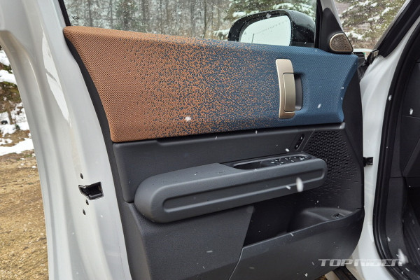 실내는 니트 형태의 대시보드와 도어는 동일한데, 페트롤&브라운 그라데이션 도어 트림과 JCW 스포츠 시트가 적용된다. 도어 그라데이션과 빈티지 브라운 컬러의 조합이 좋다. 시트는 비스킨 소재가 적용되는데, 최신 인조가죽이다. 신형 미니에는 가죽이 사용되지 않는다.