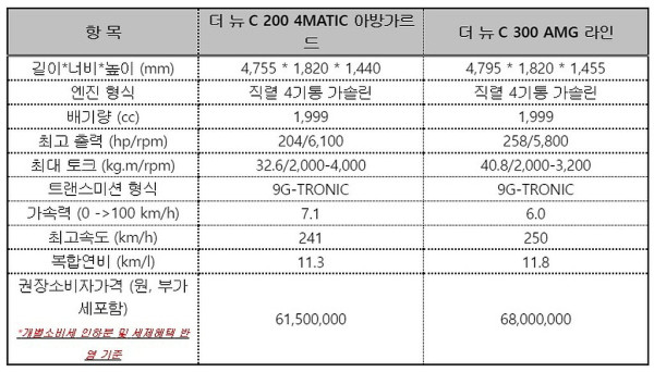 신형 C클래스는 C200 4MATIC 아방가르드와 C300 AMG 라인으로 운영된다. 가격은 각각 6150만원, 6800만원이다. C300 AMG 라인의 경우 E250 아방가르드보다 100만원이 비싼데, 차체 크기와 실내 공간을 제외한 사양과 주행감, 엔진 성능은 E250 아방가르드를 앞선다.