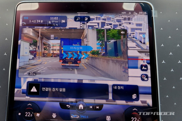전방과 측면 시야는 좋은 편이지만 후방 시야는 제한적이라 후방 카메라에 의지해야 한다. 후방과 360도 카메라의 화질은 매우 좋은 편으로, 스티어링 휠을 돌리면 카메라가 같은 방향으로 돌아가며 시야를 넓혀준다. 95% 충전시 주행가능거리는 520km 넘게 표시된다.