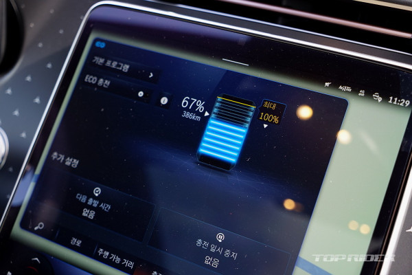 실내에는 가죽과 함께 친환경 소재가 함께 사용됐다. 시승차는 블랙 컬러 인테리어가 적용됐는데, 고급감에서는 밝은 컬러에 높은 점수를 주고 싶다. 선루프는 스와이프 방식으로, 대부분의 명령은 터치나 음성으로 가능하다. MBUX는 BMW iDrive8 보다 직관적이고 편하다.