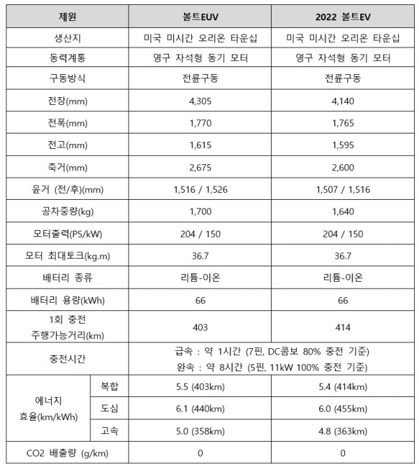 쉐보레는 부분변경 모델인 볼트EV 2022년형을 출시하며 출고 가격을 684만원 인하했다. 여기에는 운전석 전동시트와 스마트폰 무선충전, C타입 충전포트는 물론 LED 시퀀셜 방향지시등, LED 헤드램프와 리어램프가 추가됐다. 어댑티브 크루즈컨트롤 옵션도 더해졌다.