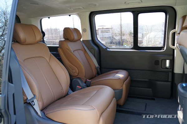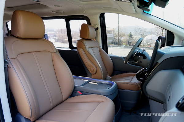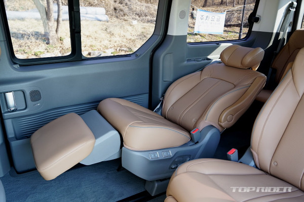 스타리아 라운지 9인승은 2열 시트가 뒤를 향하는 스위블 기능을, 7인승은 전동으로 동작되는 2열 프리미엄 릴렉션 시트를 제공한다. 시승차는 7인승 모델로, 열선과 통풍과 4-way 레그 서포트를 지원하는 전동 시트가 적용되는데, 구입을 고려한다면 꼭 경험해야 한다.