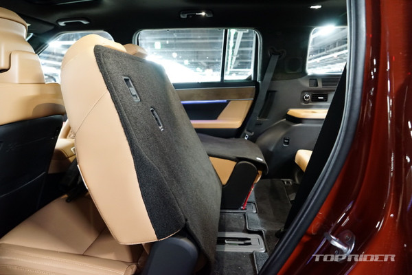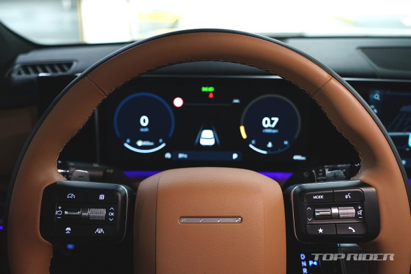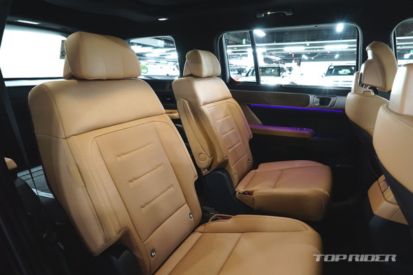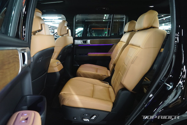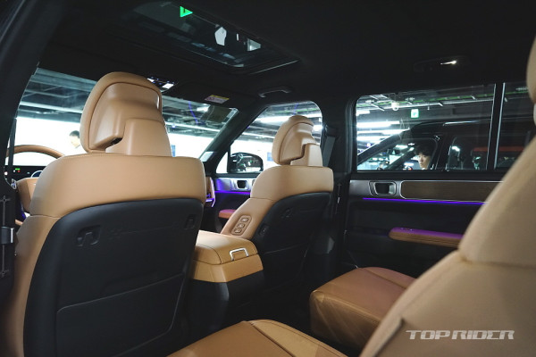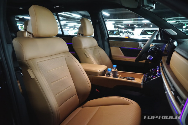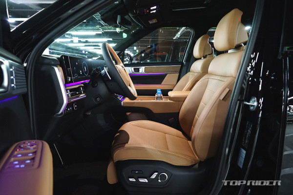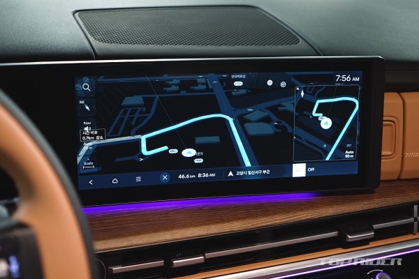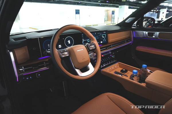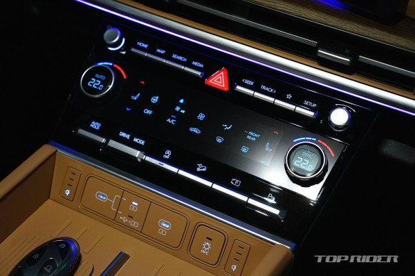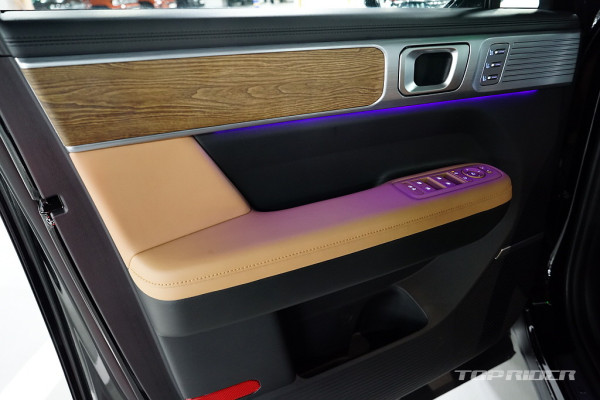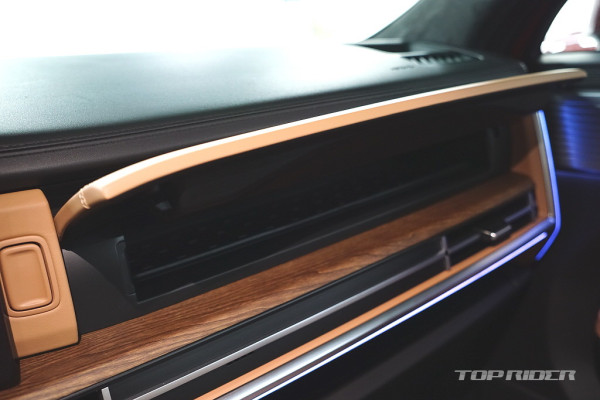 실내 고급감은 아주 인상적인데, 대시보드 상단과 도어패널의 가죽스타일 마감과 오픈포어 스타일의 우드 인레이, 헤어라인이 포함된 금속 장식은 플라스틱 성형체라고 생각되지 않을만큼 완성도가 높다. 대시보드의 디자인과 디테일, 고급감은 오히려 제네시스를 앞선다.