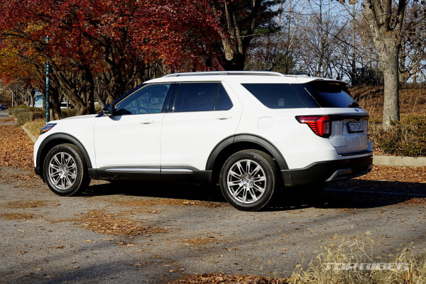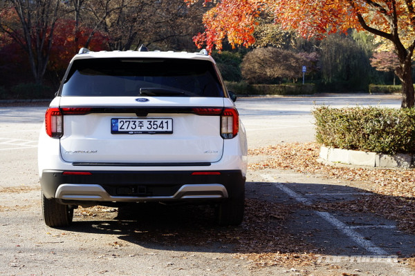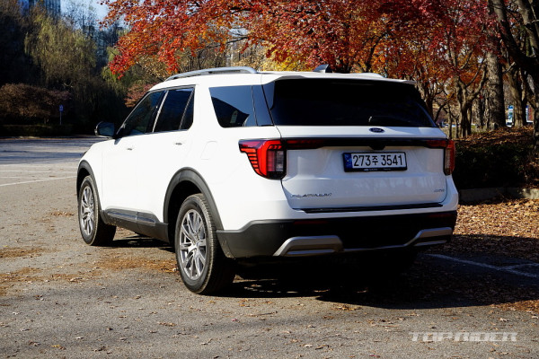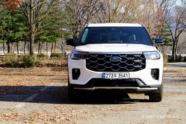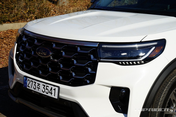 시승차는 더 뉴 익스플로러 플래티넘이다. 외관 디자인의 변화는 전면과 후면에 집중된다. 전면 그릴은 기존 마름로 디자인을 사격형 형태로 단정하게 변경했다. 플래티넘에는 크롬 디테일이 더해져 고급감을 강조했다. 리어램프는 가로바가 트렁크를 침범하며 길어졌다.