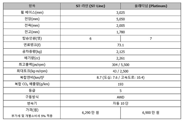 외관 디자인에서는 ST-라인에 스포트한 그릴 패턴과 레드 캘리퍼, 21인치 휠이 적용된다. 플래티넘은 오히려 20인치 휠이다. 또한 ST-라인은 2열 독립형 시트로 구성된 6인승, 플래티넘은 2열 벤치형 시트의 7인승 모델이다. 새로운 상품구성인데, 개별 트림의 장점이 있다.