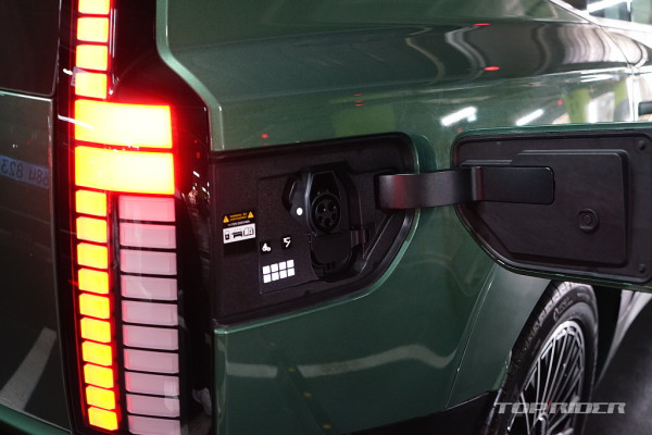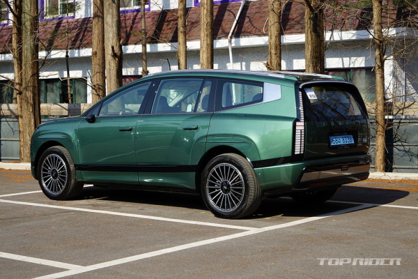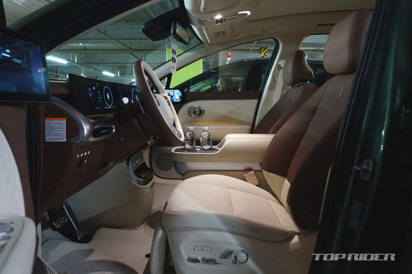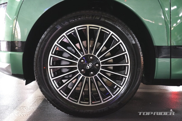 시승차는 아이오닉9 캘리그래피 HTRAC2 6인승 모델이다. 최상위 캘리그래피 트림에 성능형(157kW 전륜 모터) 4WD 시스템이 적용된 모델이다. 외관 디자인은 아이오닉9의 시그니처 컬러 조합인 이오노스피어 그린 펄 외장 컬러와 코냑 브라운/크리미 베이지 투톤, 구성이 고급스럽다.
