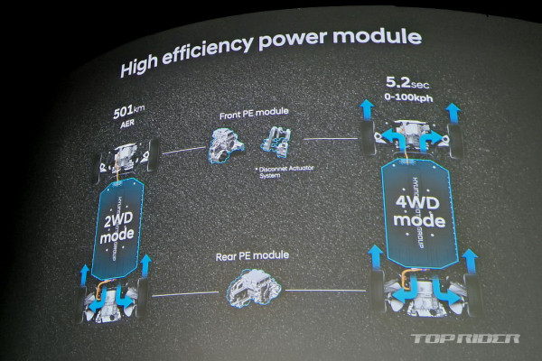 초고속주행시 전비가 의외로 좋은 모습을 보이는데, 아이오닉9에 듀얼 커패시터(Capacitor)가 적용됐다는 것이 연구진의 설명이다. 커패시터 특성에 따라 도심주행에서 고효율을 내거나, 고속주행에서 높은 효율을 보이는데, 모두를 만족시킨다. 전륜에는 디스커넥트 액추에이터가 적용됐다.