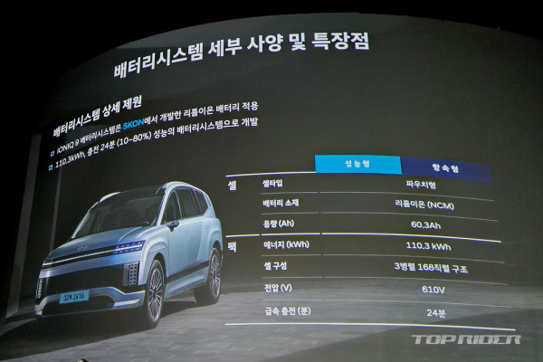 아이오닉9에는 110.3kWh 리튬이온 배터리팩이 기본으로 적용된다. 싱글 전기모터는 후륜구동으로 공차중량 2510kg, 최고출력 160kW(218마력), 최대토크 35.7kgm, 복합 주행거리 532km, 시승차는 성능형 4WD로 2675kg, 315kW(428마력), 71.4kgm, 복합 501km(도심 544, 고속 449)다.