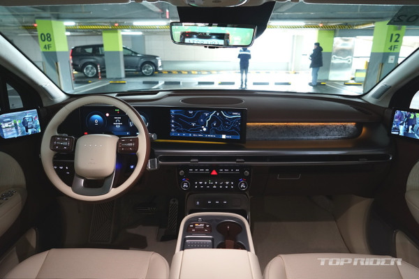 운전석에서의 시트포지션은 여느 대형 SUV와 다르지 않다. 시트가 살짝 높게 느껴지는데, 인테리어와의 어울림이 좋아 안정적이다. 전방은 물론 측후방 시야가 좋다. 디지털 사이드미러는 풍절음을 줄여주나, 여전히 거리감에서는 부족하다. 가파른 A필러로 선바이저가 다소 가깝다.