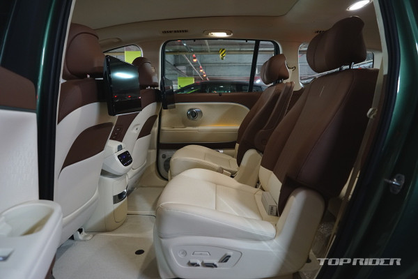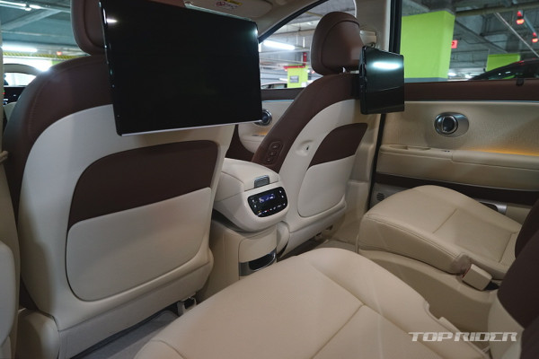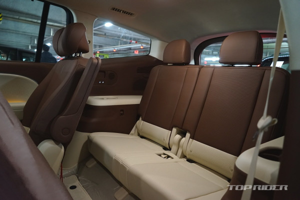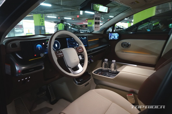 실내는 수평형 대시보드와 커브드 디스플레이를 통해 개방감이 강조됐다. 전체적으로 동글동글한 디자인을 통해 아늑한 느낌을 전한다. 앰비언트 라이트가 적용된 부분에서 소재감을 살린 점은 EV9 대비 앞서는 부분이다. 3열 공간의 헤드룸을 비롯한 거주성은 신형 팰리세이드를 앞선다.