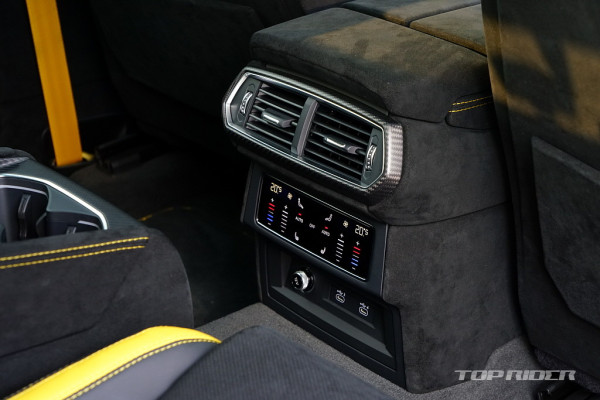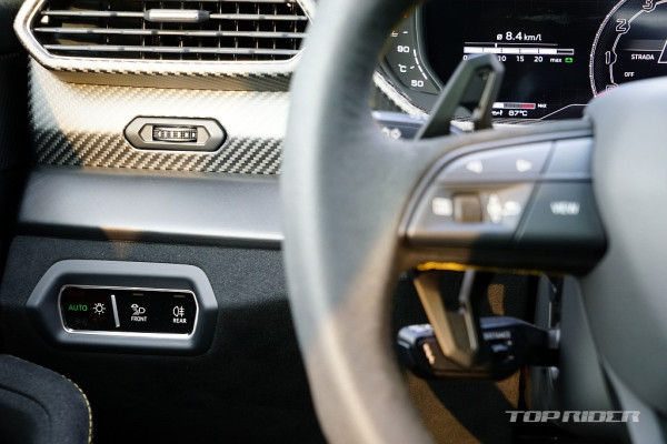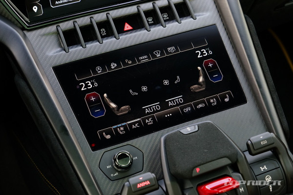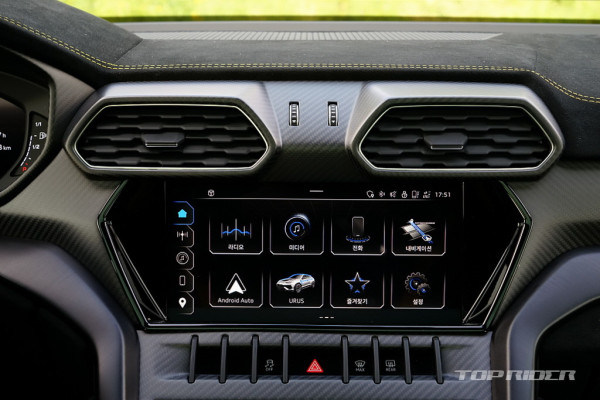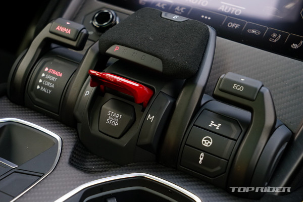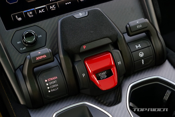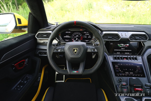 센터터널의 기어 조작부와 ANIMA 컨트롤러는 우루스의 상징과 같은 디자인이다. 조작감이 좋고, 커버가 씌워진 스타트버튼은 여전히 멋스럽다. 스위치류는 폭스바겐그룹의 아우디의 것을 대부분 가져왔는데, 전체적인 람보르기니 디자인 감각이 강해 이질감은 적은 편이다.