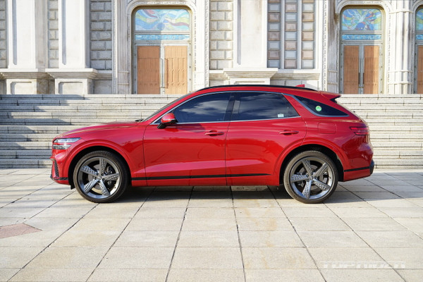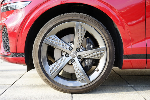 GV70 시승차는 스포츠 패키지가 적용된 모델로 과감한 디자인의 전면 범퍼와 블랙 그릴, 대구경 머플러팁, 전용 21인치 휠을 통해 스포티한 감각이 강조됐다. GV70의 차체 크기는 전장 4715mm, 전폭 1910mm, 전고 1630mm, 휠베이스 2875mm로 BMW X3와 유사하다.