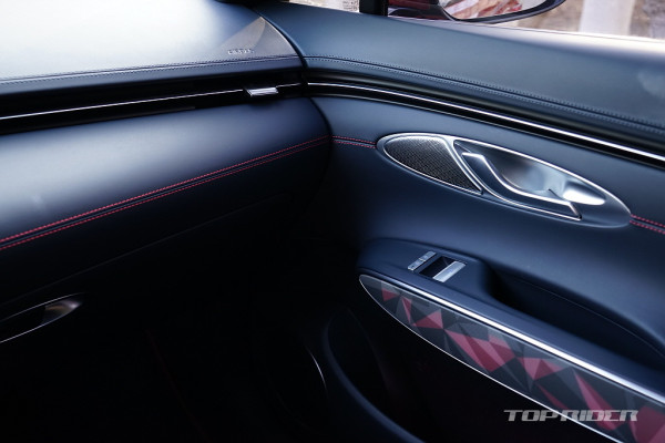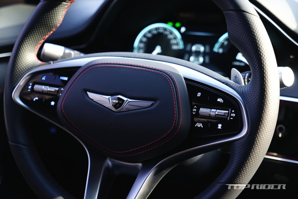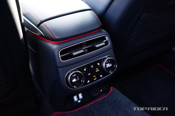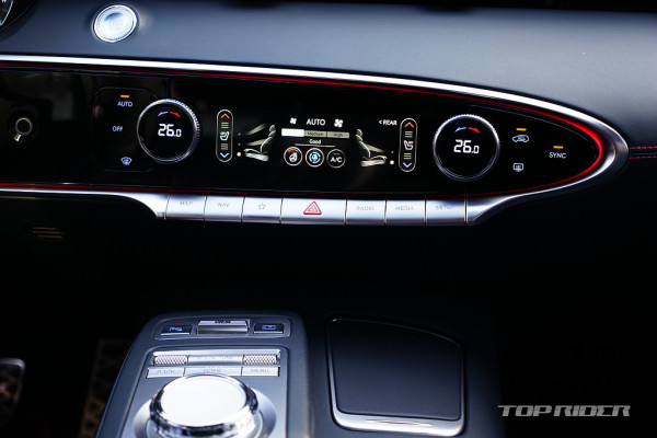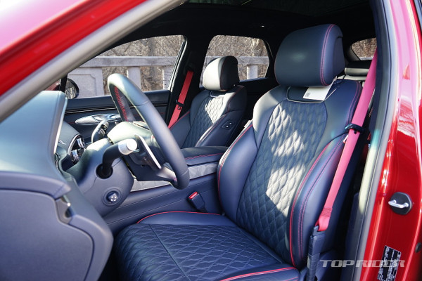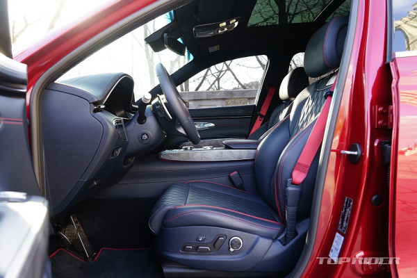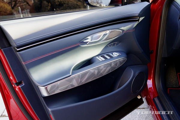GV70의 실내 고급감은 동급 경쟁차 중 가장 높게 평가되는 부분이다. 특히 시그니쳐 디자인 셀렉션2나 스포츠 디자인 셀렉션을 선택할 경우, 230~300만원으로 나파 가죽시트는 물론 인조 가죽과 스웨이드가 대거 추가된다. 다른 소재간의 컬러 통일감이 최근 크게 좋아졌다.