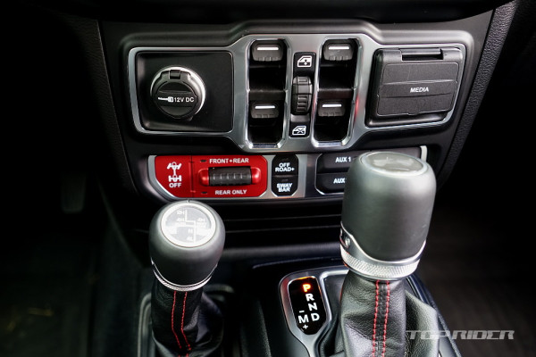 루비콘 모델의 오프로드 플러스(OFF ROAD+) 버튼을 누르면 현재 차량이 달리고 있는 지형을 자동 분석해 스로틀, 셀렉-스피드 컨트롤, 트랙션 제어, 변속기 모드 등 주요 시스템 조정을 통해 주행을 최적화한다. 일종의 적응형 지형 반응 시스템의 개념이 신규 도입된 셈이다.