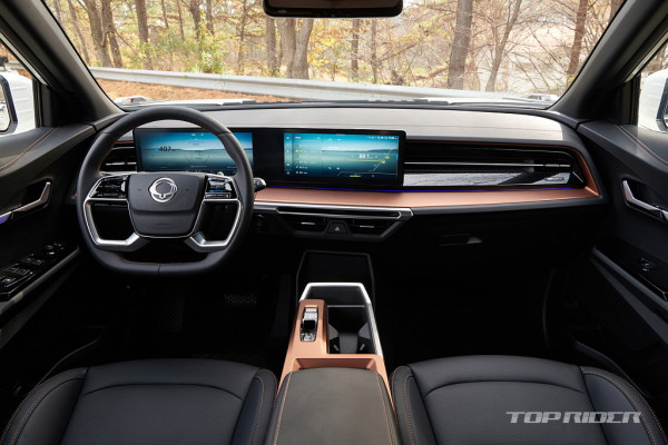 내연기관차 기반의 전기차라고 하나 기존 토레스의 실내공간 헤드룸이 워낙 여유로워 차체 하단에 추가된 배터리팩으로 인한 공간 감소는 알아채기 어렵다. 충전 포트의 위치는 애매할 수 있는데, 국내 고속충전기의 굵고 무거운 커넥터를 고려하면 차체 손상이 우려된다.