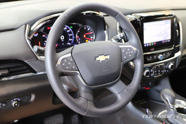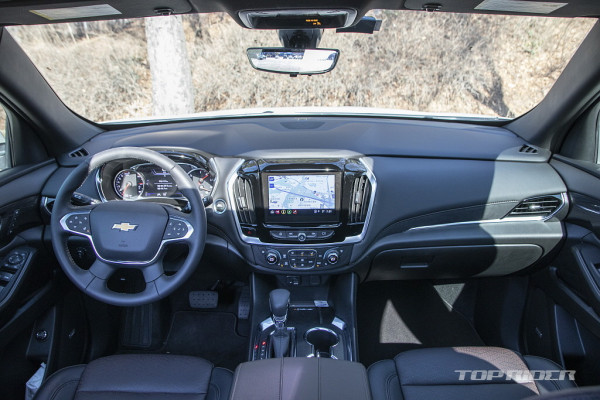 신형 트래버스의 실내 레이아웃은 기존과 같다. 다양한 터치식 버튼과 앰비언트 라이트 등 화려함이 강조된 타 브랜드 모델들과는 차이가 있다. 올드하다는 평가가 많은데, 버튼 디자인과 배열이 직관적이어서 사용하기는 편하다. 8인치 디스플레이는 넓은 실내와 대비된다.
