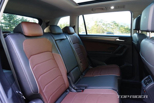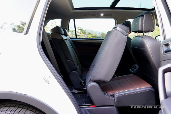 실내공간은 여유롭다. 티구안 대비 확대된 2열 레그룸은 전후 슬라이딩과 등받이 리클라이닝을 제공해 중형 SUV 수준의 공간과 거주성을 확보했다. 3열로 진입하는 통로에 발받침이 추가됐다. 3열은 만약을 고려한 공간으로 성인의 경우 단거리 이동 정도는 소화 가능하다.