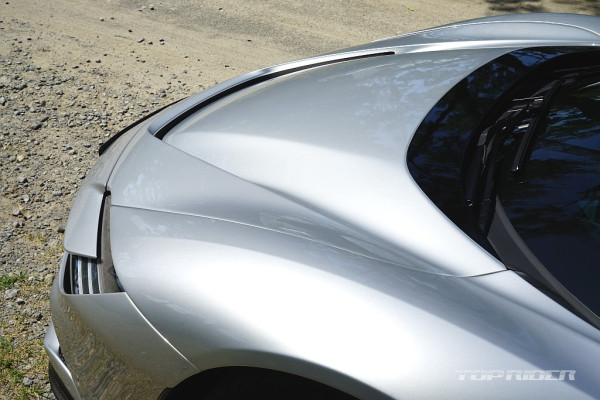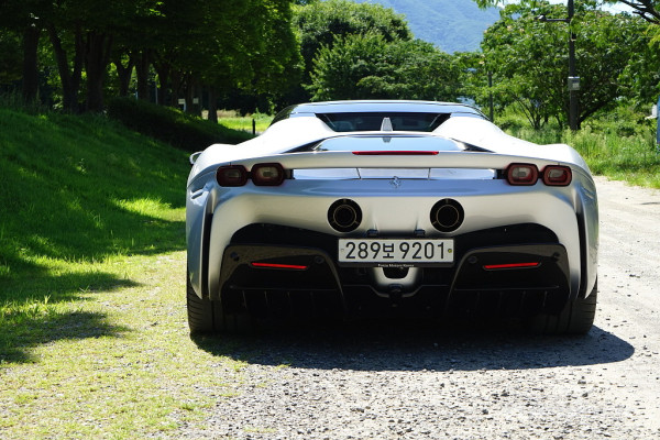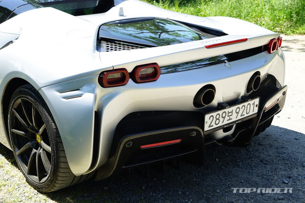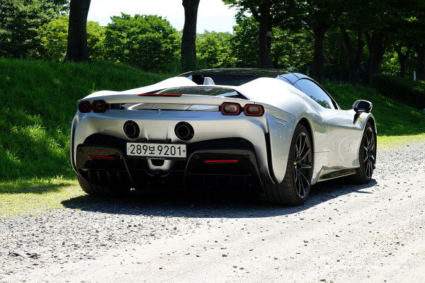 SF90 스파이더의 외관은 아름답다. 낮고 와이드한 보디의 존재감은 사진으로 담아내기 어렵다. 실물을 접하면 모두의 시선을 사로잡을 만큼 매력적이다. 특히 실버 컬러의 색감이 꽤나 매력적인데, '페라리=레드'라는 공식을 적어도 SF90 스파이더에서는 예외로 해두고 싶다.