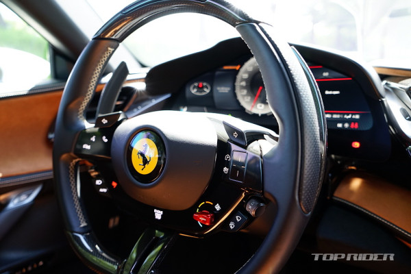 90도로 벌어진 V8 엔진은 드라이 섬프 냉각 시스템을 사용하고, 엔진 리스폰스 향상을 위해 전자식 웨이스트게이트를 적용했다. 터보차저 시스템의 적용이 초기 터보랙을 만들어내고, 배기사운드에 악영향을 미친다는 편견은 페라리의 최신 엔진에는 적용되지 않는다.