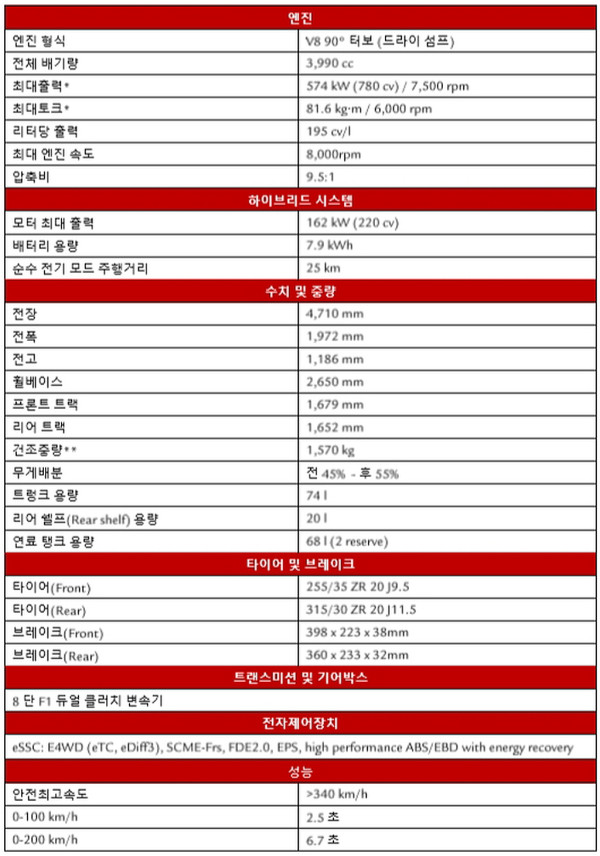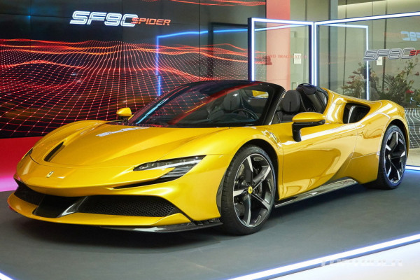 SF90 스파이더에는 780마력의 4.0리터 V8 터보 엔진과 합산 220마력 3개의 전기모터가 프론트 액슬에 2개, 엔진과 8단 듀얼클러치 변속기 사이에 위치해 총 1000마력을 발휘한다. 국내 인증 공차중량 1880kg, 복합연비 7.2km/ℓ, 전비 2.6km/kWh, 전기 주행거리 15km다.