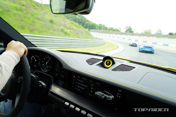 가장 먼저 탑승한 911 GT3는 911 유일의 고회전 자연흡기 모델이다. 최고출력 510마력은 평범해 보일 수 있는데, 8400rpm에서 발휘되는 최고출력과 1500kg의 가벼운 차체, 그리고 315mm에 달하는 미쉐린 파일럿 스포츠 컵2 타이어의 밸런스는 여타 911을 가볍게 앞선다.