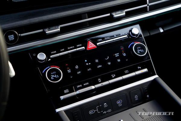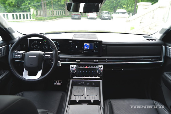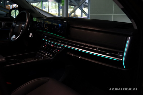 실내 고급감은 아주 인상적인데, 대시보드 상단과 도어패널의 가죽스타일 마감과 우드 인레이, 헤어라인이 포함된 금속 장식은 완성도가 높다. 특히 다른 소재간의 컬러 일체감과 조합 면에서는 최근 실력이 크게 향상됐다. 제네시스에서의 성과가 현대차로 내려온 느낌이다.