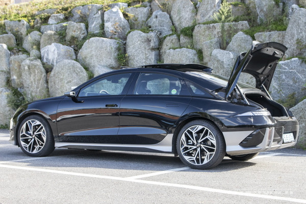 측면부는 유선형으로 자연스럽게 연마된 강돌과 같은 이미지로 오토 플러시 도어핸들이 적용됐다. 후면부 테일램프는 길게 뻗은 형태로 차체 폭을 강조한다. 일체형 스포일러가 탑재됐다. 아이오닉6의 트렁크 용량은 기본 401ℓ다. 전면 트렁크 용량은 AWD 기준 14.5ℓ다.