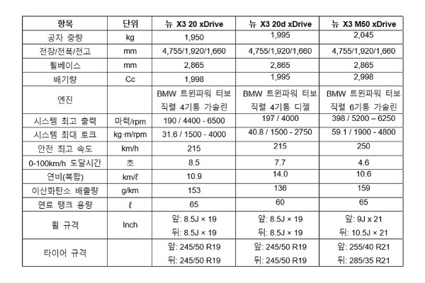 시승차는 X3 20 xDrive 모델로 2.0리터 4기통 가솔린 터보엔진과 8단 자동변속기, 사륜구동 시스템이 조합돼 최고출력 190마력(4400-6500rpm), 최대토크 31.6kgm(1500-4000rpm)다. 공차중량 1950kg, 100km/h 정지가속 8.5초, 복합연비 10.9km/ℓ(도심 10.0, 고속 12.4)다.