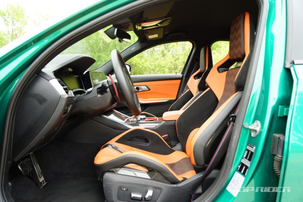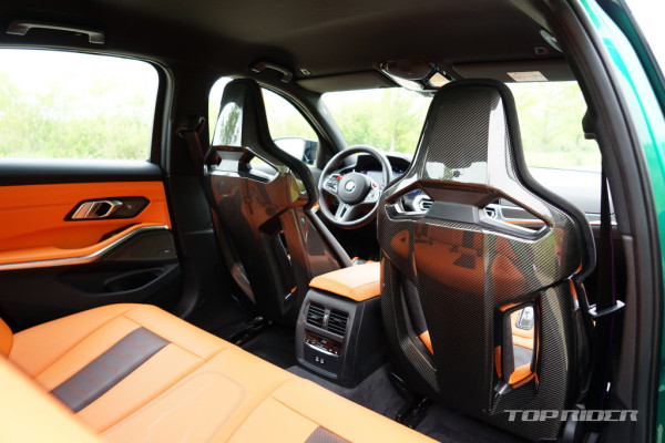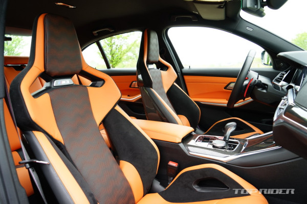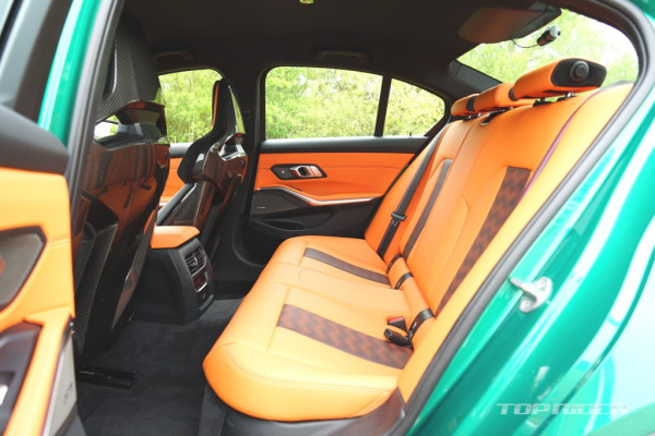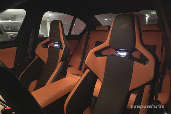 M3 컴페티션의 시트 포지션은 상당히 낮다. M 카본 버킷 시트의 착좌감은 생김새와 다르게 부드럽고 편안한데, 타고 내리기가 다소 불편하다. 사이드 볼스터를 조절할 수 있다. 2열 레그룸은 얇은 1열 버킷 시트 덕분에 일반 3시리즈 대비 넓다. 2열 시트 착좌감도 좋다.
