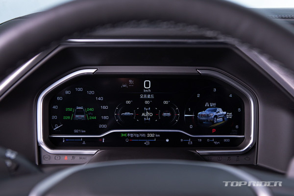 전면부 대형 그릴을 비롯해 외관 곳곳에 적용된 크롬 디테일은 트랜스포머 옵티머스 프라임이 연상될 만큼 화려하다. 가로로 긴 사이드미러는 트레일러 운용시 시야를 확보하기 위함이다. 다양한 뷰의 360도 카메라와 내장형 트레일러 히치 리시버와 커넥터가 기본이다.