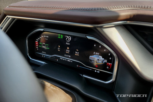 어댑티브 크루즈컨트롤은 정차와 재출발, 차로유지보조를 포함한 최신 버전이다. 장거리 운전시 피로감을 줄여주는 요소로, 구간단속시 필수 아이템이다. 차로유지보조에 차로중앙유지가 빠진 점은 아쉽다. 연비는 평균 7km/ℓ 전후로, 80km/h 정속주행시 13km/ℓ 수준이다.