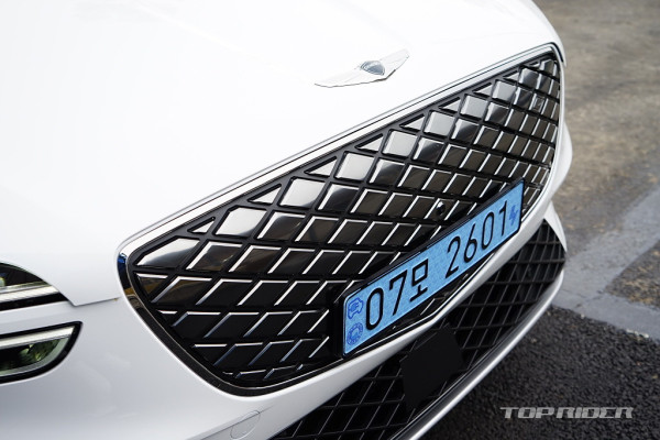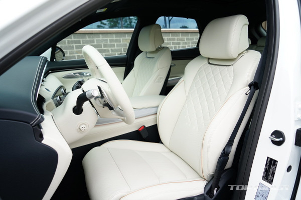 실내는 화사한 색감의 화이트 컬러로 구성돼 고급감이 돋보인다. 스티어링 휠은 GV70 스포츠의 3-스포크 형태를 기반으로 하이그로시가 아닌 일반적인 물리버튼이 적용됐는데, 이 부분의 디자인이 고급스럽게 다가온다. 도어와 대시보드의 가죽 마감은 포르쉐가 연상된다.