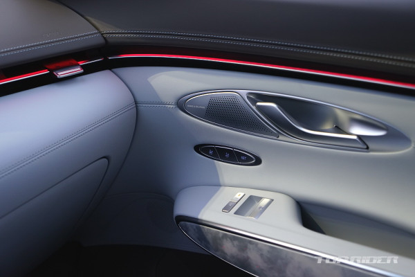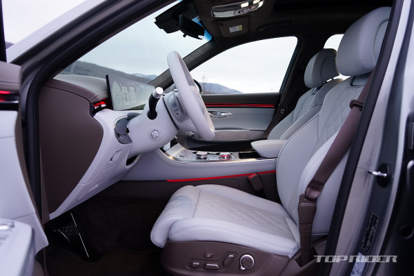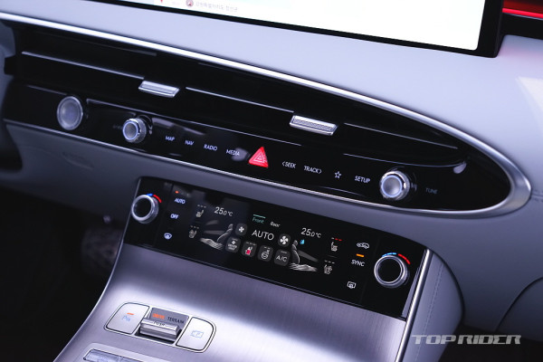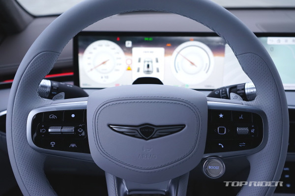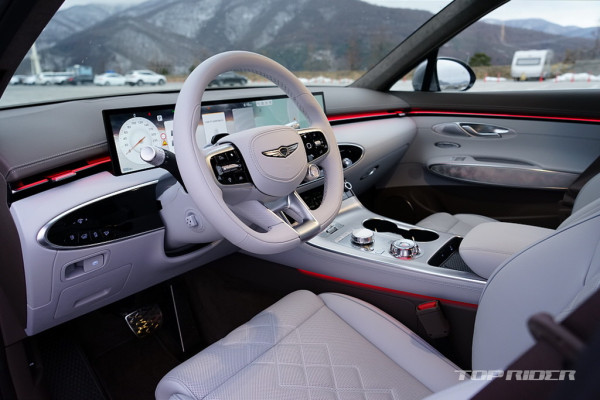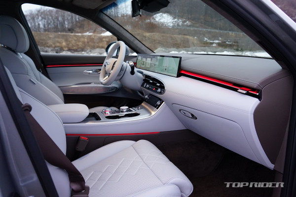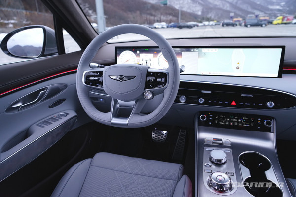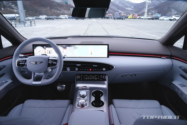 운전석은 넓은 시야와 고급차스러운 감성을 충분히 전한다. 전기차의 재활용 소재가 주는 저렴함이 불만이라면 GV70 전동화 모델이 정답이다. 또한 최근 출시된 X3, GLC, 마칸 전기차의 실내 고급감이 하향됐음을 고려하면 더욱 그렇다. 시승차는 어반 브라운/프로즌 그레이 투톤 사양이다.