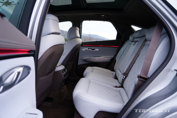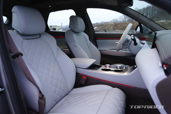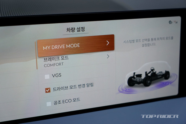 일상주행에서의 승차감은 부드러운 편이다. 기존 모델의 출렁임에 가까운 부드러움에서 다소 정제된 부드러움으로 개선됐다. 특히 앞뒤 피칭이 크게 줄어 전기차의 급가속과 급감속 상황에 어울린다. 후륜 PE 마운트 부싱과 후륜 크로스멤버 전방 하이드로 부싱, 감쇠력 제어가 개선됐다.