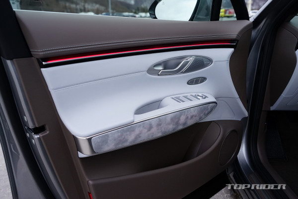 실내는 27인치 OLED 통합 디스플레이를 통해 최신 트렌드를 담았다. GV70에서도 고급감은 시그니쳐 디자인 셀렉션2(230만원) 선택시 완성된다. 도어트림 상단과 대시보드 가죽 커버링과 스웨이드 헤드라이너가 고급스럽다. 소재와 색감의 통일성이 주는 고급감은 동급에서 최고다.