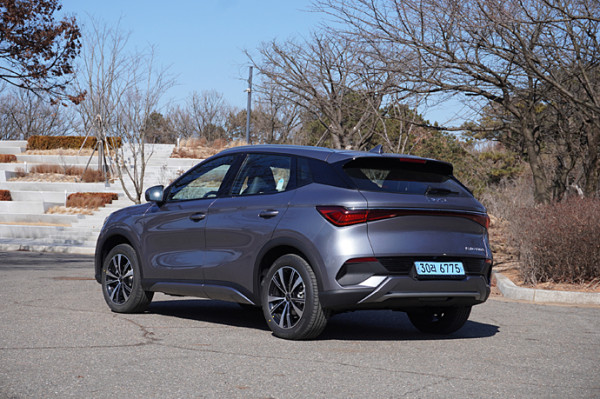 측면에서는 레인지로버 이보크 이후 많은 모델이 벤치마킹한 뒤쪽으로 경사져 내려가는 루프라인으로 날렵함을 표현하고 있다. 앞 펜더에서 테일램프로 이어지는 캐릭터 라인은 새롭지는 않지만, 마찬가지로 무난하게 받아들여지게 하는 요소다. 한국타이어 아이온 18인치가 장착되어 있다. 차체 크기와 비례한다.
