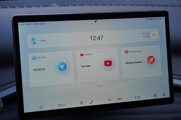 3스포크 스티어링 휠 가운데 BYD 로고가 자리한다. 스포크의 버튼류는 익숙한 방식이다. 특별히 튀지 않는다는 얘기이다. 대시보드 부분에서 가장 도드라진 것은 동그란 에어 벤트다. 도어 핸들과 같이 설계된 트위터는 기능성보다는 예술성을 따진 것으로 보인다. 트위터의 정확한 위치는 A필러 맨 아래다. 이것을 지키는 메이커가 많지 않다. 센터 스택과 도어트림의 버튼류도 테슬라와는 다른 오늘날 레거시 업체들의 트렌드를 따르고 있다.