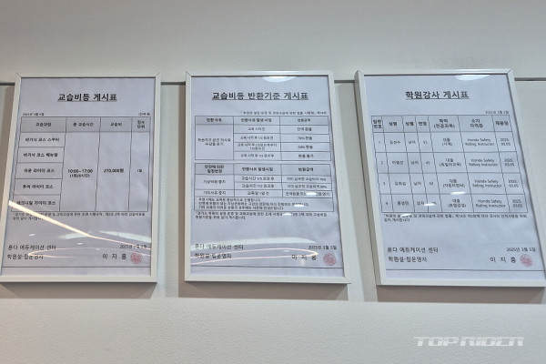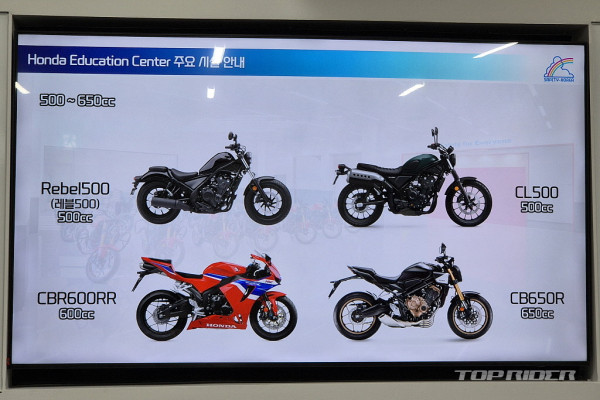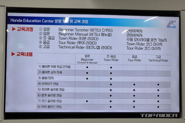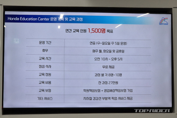 교육 대상은 혼다 바이크 소유주 뿐만 아니라 바이크 교육이 필요한 누구나 신청할 수 있고, 비용은 27만원/일(회당 6시간)로 통일해 부담을 줄였다. 교육 과정은 <비기너 코스 스쿠터>, <비기너 코스 매뉴얼>, <타운 라이더 코스>, <투어 라이더 코스>, <테크니컬 라이더 코스>로 구성된다.