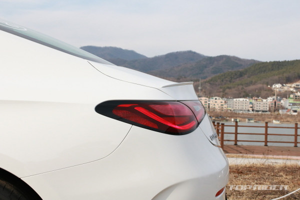 후면부 테일램프는 넓은 차체 폭을 강조한다. 후측면부 팬더는 볼륨감이 상당하다. CLE 쿠페 외관은 AMG 라인이 기본이다. AMG 전용 전면부 및 후면부 에이프런, 차체 원톤 컬러 AMG 사이드 에이프런, AMG 전용 머플러 등으로 구성됐다. 외관에서 아쉬운 부분도 있다.